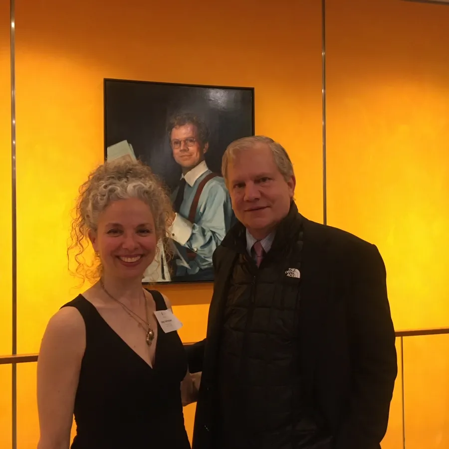 Katy Schneider poses with Arthur Ochs Sulzberger, Jr. in front of the recently unveiled painting of the former New York Times publisher. Photo by Alice Schneider.