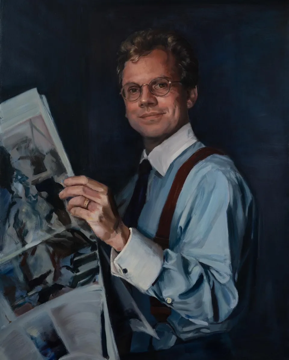 “Typically, I prefer to paint from direct observation. I also take videos and photos of my subject. In this case, I did not meet my subject. I had one photo and these words to work from: Arthur Ochs Sulzberger Jr., now 71 years old, was the publisher of The New York Times from 1992 to 2018. The portrait we seek would show him as a younger man. Among his defining social characteristics are informality, humor, geniality, and youthfulness. As an executive, he was innovative, daring, impatient, and unafraid of taking risks. (In his spare time, he was a rock climber and motorcyclist.) The photo we selected had an appealing expression and posture. In it, he holds a mockup version of the paper’s first color Weekend section. Given that the Times—formerly nicknamed the Gray Lady— would begin to feature color photography on the front page for the first time under Sulzberger's tenure, this seemed like a good choice!"