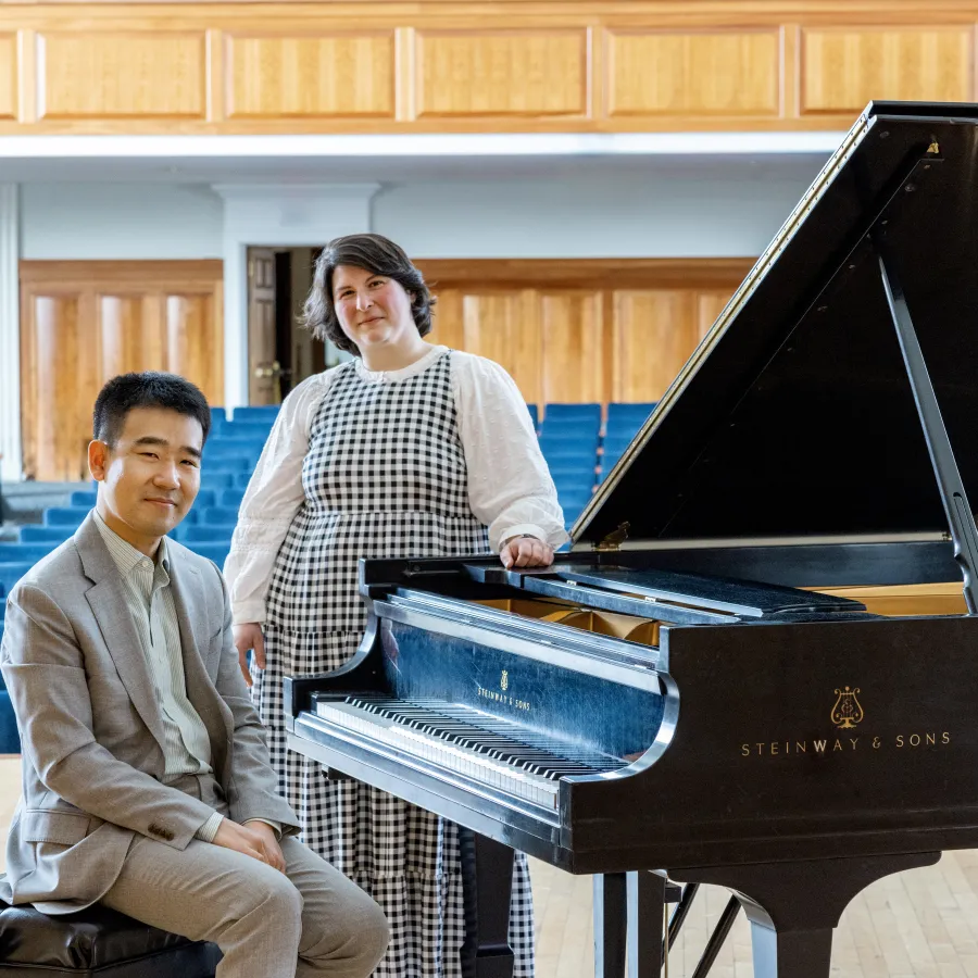 Jiayan Sun, assistant professor of music and associate chair for performance activities and Anna Goudreau, administrative coordinator for the music department, keep careful track of Smith’s “fleet” of pianos, including the Steinway in Sage Hall. Photo by Jessica Scranton.