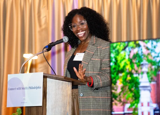 “Friendships made at Smith are powerful and enduring,” President Sarah Willie-LeBreton remarked to a crowd of 90 or so gathered at the Merion Tribute House in Philadelphia on March 24. The observation was met with knowing approval by the audience of Smith alums, most of whom didn’t get past the event check-in table without being recognized and pulled into conversation. Yet the president’s stop in Pennsylvania was not only a celebration of existing friendships. It was also an opportunity—and catalyst—for Smithies to connect after Smith.