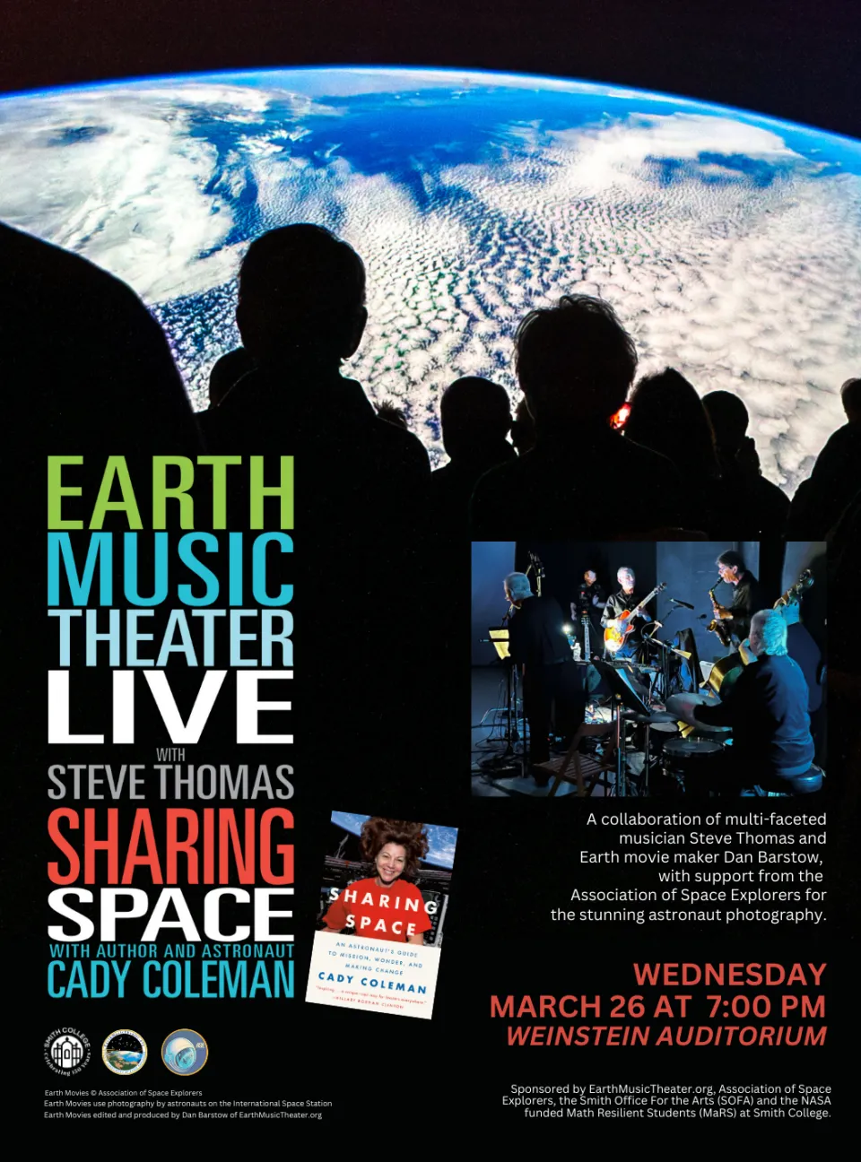 The Smith Office for the Arts (SOFA) presents a special Smith performance of Earth Music Theater Live with Steve Thomas and Sharing Space with Cady Coleman on March 26, 2025. The free event will take place at 7 p.m. in the Weinstein Auditorium, Wright Hall at Smith College. A multidisciplinary program combining the unforgettable experience of astronaut-captured visuals from the International Space Station and Thomas’ genre straddling Guitarscapes and Folktales and Fusions music. Former NASA astronaut Cady Coleman will be sharing videos and inspiring stories from her book Sharing Space, An Astronaut’s Guide to Mission, Wonder and Making Change. A cinematic, multimedia, educational experience, designed to provoke thinking about the whole Earth and planetary stewardship.