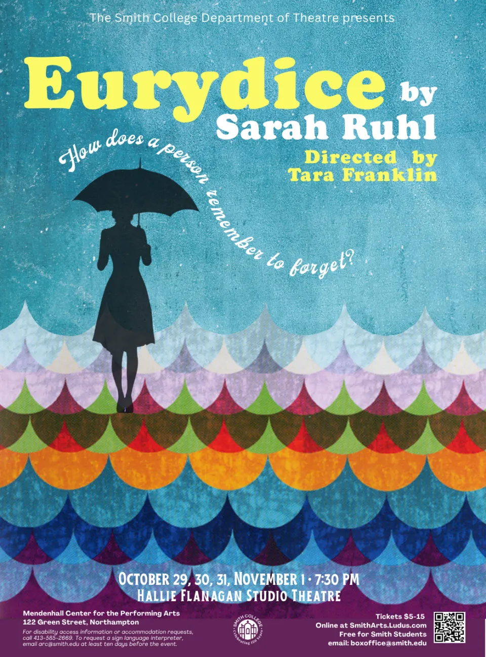 Northampton, MA — The Smith College Department of Theatre presents Eurydice by Sarah Ruhl on October 29, 30, 31, and November 1 at 7:30 p.m. in Hallie Flanagan Studio Theatre, directed by Tara Franklin. In Eurydice, Sarah Ruhl reimagines the classic myth of Orpheus through the eyes of its heroine. Dying too young on her wedding day, Eurydice must journey to the underworld, where she reunites with her father and struggles to remember her lost love. With contemporary characters, unexpected plot twists, and breathtaking visual effects, the play is a fresh look at a timeless love story. Tickets at SmithArts.Ludus.com from $5 to $15. Free for Smith students by emailing boxoffice@smith.edu.