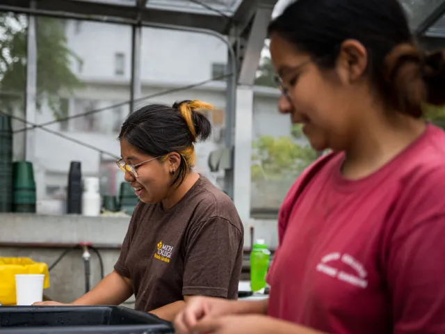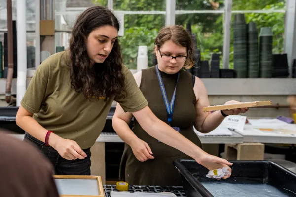 Smith Botanic Garden interns Marge Poma ’23 (left) and Waleska Reyes ’23 try their hand at papermaking in a new studio being created in the greenhouse at Capen Gardens.