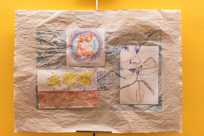 In December 2023, an exhibit of the class’s art projects allowed others on campus to see Gersony’s students’ creations, which included poetry, paintings, collages, sound recordings, fiber arts, and handmade books. For the show, students provided labeled descriptions of their work. An interactive sculpture by Chlo Gold ’25, titled The Production!, illustrated the process of carbon dioxide (CO2) fertilization. Using a bell jar, straws, sequins, and beads, participants were encouraged to blow through a straw and observe as the wheel inside the bell jar started moving, with breath as the catalyst. “As we learned in class, CO2 fertilization, which increases CO2 in the atmosphere, is purported by climate change deniers to benefit plants,” says Gold. “However, the positive effect is short lived and eventually these heightened CO2 rates deplete the system and prove detrimental to plants. Rather than demanding productivity and output from plants, my piece poses an alternate reality where we embrace slowness and smallness from our botanical kin, and for ourselves.”