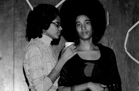 Attending a Black Students’ Alliance board meeting at the Mwangi Cultural Center are, from left, front row: Patricia Samuels Blanchard ’74, Patricia McCalla Harden ’73, M.S.W. ’82, Portia Gordon ’74, Sylvia (Cookie) Smith Lewis ’74, and an unidentified student; back row: Linda Smith Charles ’74 and William Boulware (Wesleyan ’71).