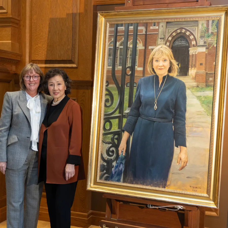 Kathleen McCartney, left, with artist Ying-He Liu at the portrait unveiling.