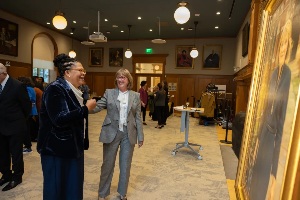 Current Smith President Sarah Willie-LeBreton talks with Kathleen McCartney while admiring the portrait.