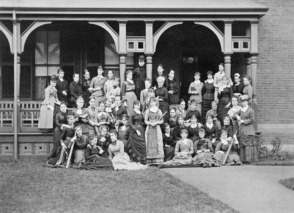 For Professor Emerita Susan Van Dyne, this photo of the class of 1883 on the porch of Hubbard House in fall 1880 perfectly encapsulates Smithies’ penchant for resisting traditional gender norms.