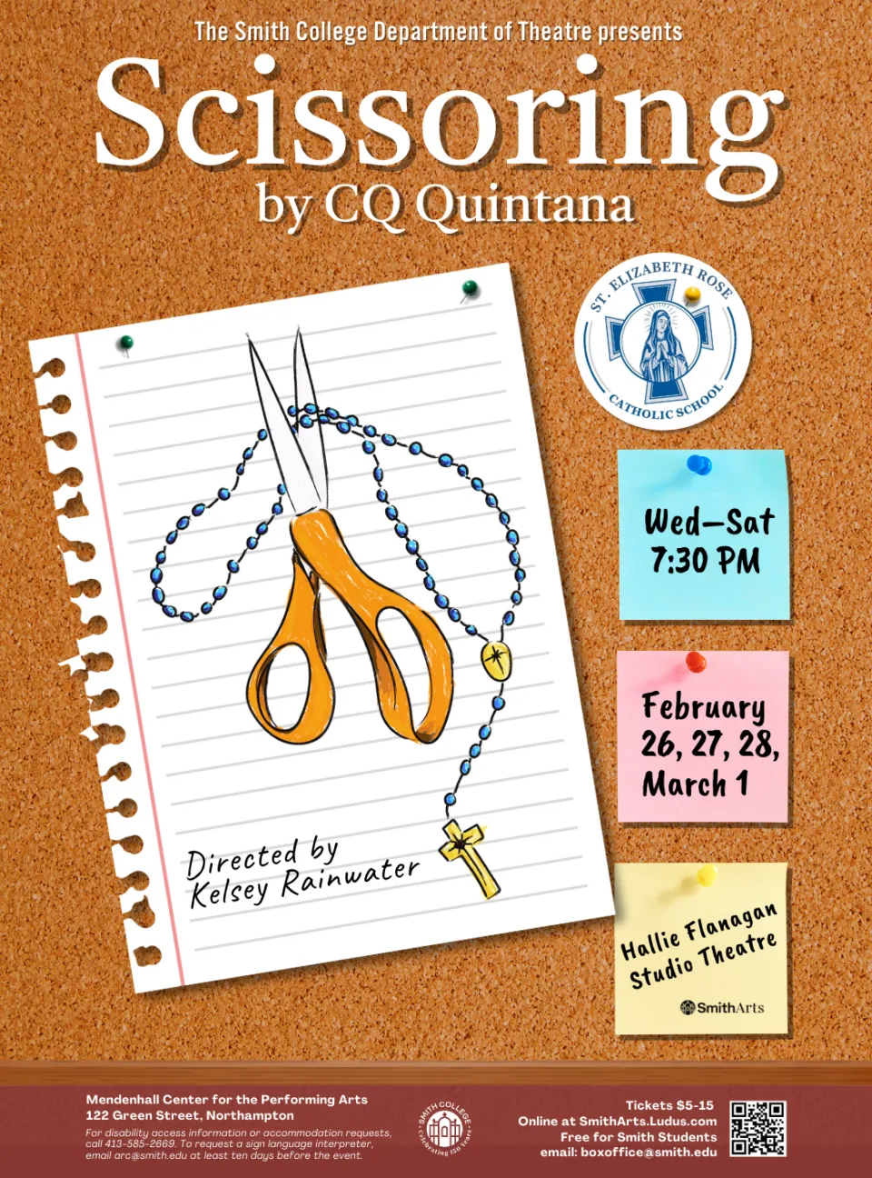 Northampton MA - The Smith College Department of Theater presents Scissoring by CQ Quintana, directed by Kelsey Rainwater on February 26, 27, 28, and March 1 at 7:30 p.m. in Hallie Flanagan Studio Theatre. When Abigail Bauer takes a job as a teacher at a conservative Catholic school, she is forced to step back into the closet against the wishes of her long-term girlfriend. As she struggles to reconcile her professional ambitions, personal relationships, religious beliefs, and internalized shame, Abigail receives guidance from First Lady Eleanor Roosevelt and Eleanor’s devoted friend and lover, Lorena Hickok. Tickets $5–15 at smitharts.ludus.com.