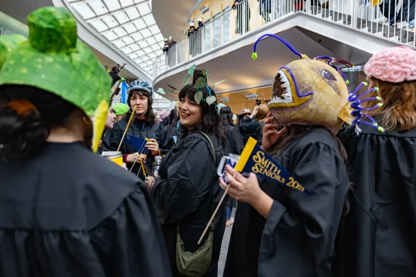 With seniors crafting hats made to look like everything from flowers and anglerfish to the Titanic, there’s no shortage of creativity at Rally Day, and this year’s celebration, held last month, was no exception. Ahead of the introduction of this year’s Smith Medalists and Commencement speakers, another example of Smithie creativity took center stage—literally—when the Glee Club was invited up to perform a song titled “Students of Smith,” a short number complete with simple dance moves, a double entendre or two, and a few good-natured jabs at Wellesley and Mount Holyoke.