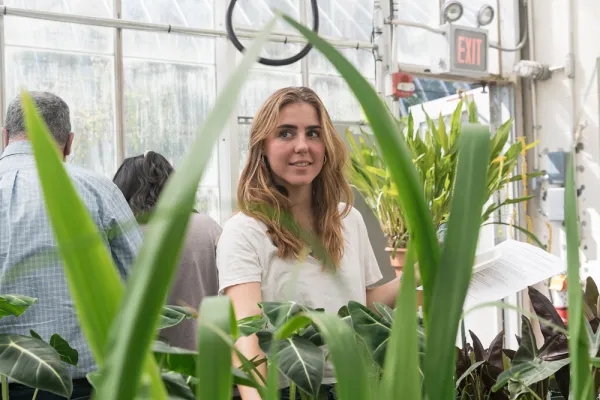 Not that new students seemed to mind. Moving past trays of flower-shaped jades and graceful, tall alocasias, Jackie Muñoz ’26 paused at an impatiens with peach-colored leaves. She said she wanted something that reminded her of her grandmother’s extensive plant collection. Duha Syar ’26, in the greenhouse with family, had tucked under her arm a striking plant that she hoped would bring “a lot of home to campus.”