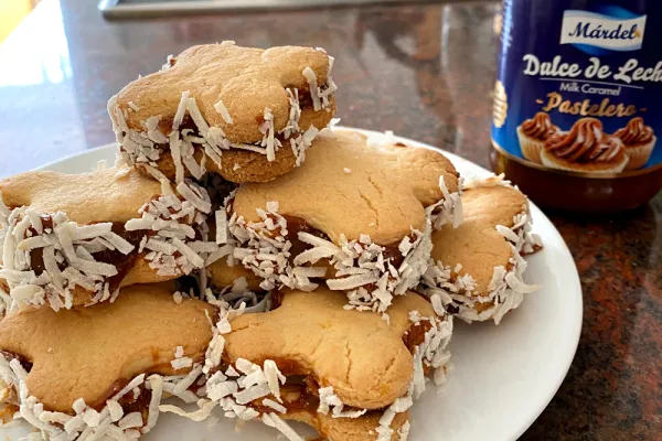 Bake in the oven at 350ºF until the cookies are golden brown. Let them cool and then fill them with dulce de leche and coconut.