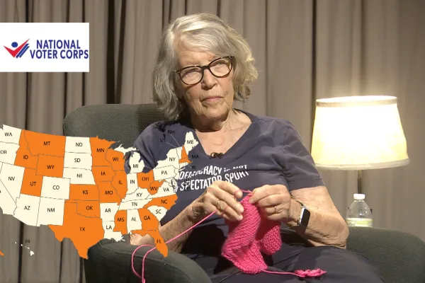 A screenshot of a video where Alice Schaffer Smith ’61 encourages citizens to check their voter registration status. States highlighted on the map indicate that citizens may be purged from voter rolls if they were registered but did not vote in the most recent election.