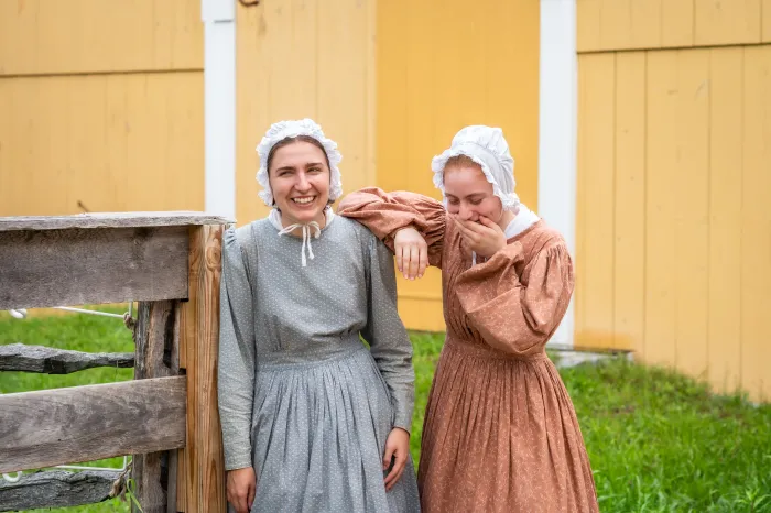Ella McDaniel ’25 (left) and Simone Tricca ’25 (right) interning at Sturbridge Village as costumed interpreters. It "was a totally different way of learning about history," Tricca said, adding that one of the most rewarding parts was the conversations with visitors about both historical and contemporary issues.