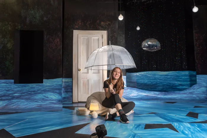 Jane MacLaughlin ’24 as a stage management intern at Chester Theatre. She supported logistics for productions of Birds of North America and To The Moon.