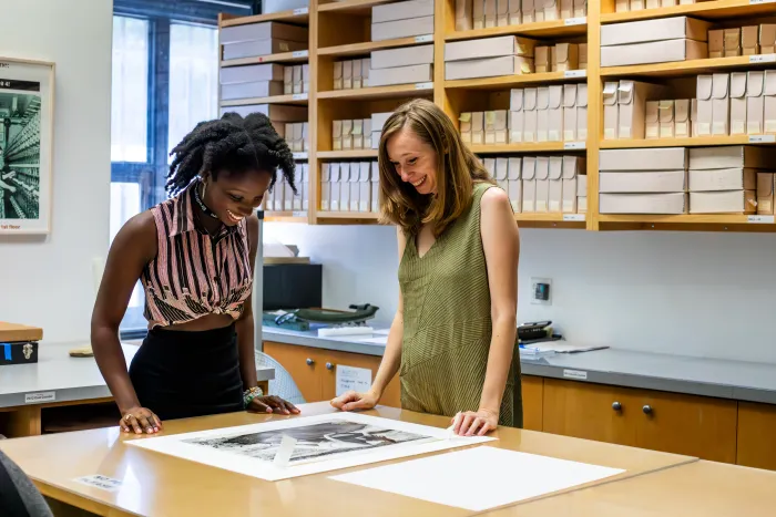 Sena Amuzu ’24 (left) interning at the Brooklyn Museum, where she supported the major reinstallation of the American Art galleries.