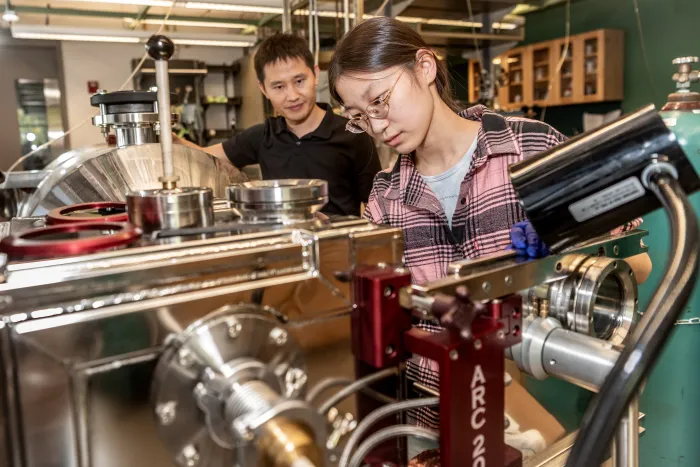 Xinyun Guo ’25 at the Multiscale Materials and Manufacturing Lab at University of Massachusetts Amherst, where she worked on 3D printing of advanced metal alloys.
