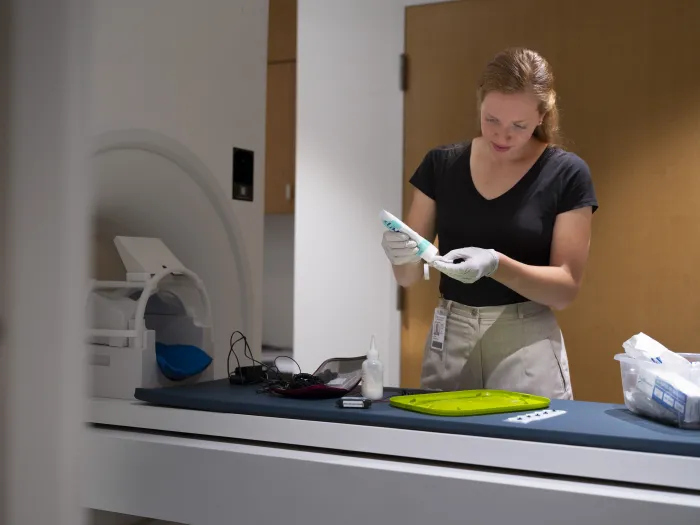 Emma Robertson '25 prepping for a participant in her lab's stressor controllability study. Emma interned at Yale University's Clinical Affective Neuroscience and Development Lab.