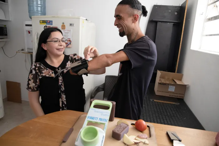 Ariana Panduro Zamorano '25 (left) with Edison Esteban Barrientos, recipient of a prosthetic that Ariana worked on as part of her internship with Humanos 3D, a nonprofit company based in Colombia that develops personalized solutions for people with disabilities.